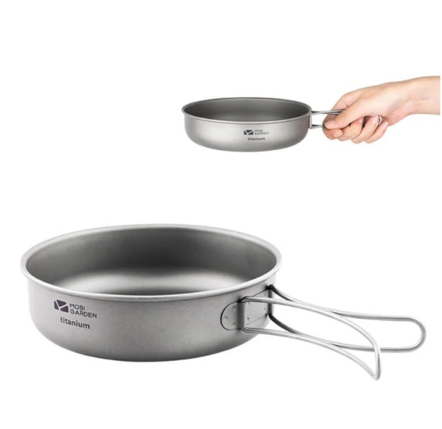 Титанова сковорода Mobi Garden Saucepan Titanium виготовлення з високоякісного титану, що надає їй виняткових характеристик: вона надзвичайно легка, але при цьому дуже міцна і може витримувати високі температури, що робить її ідеальною для інтенсивного використання. Особлива структура титану запобігає будь-якій хімічній реакції з їжею, забезпечуючи збереження її природного смаку і аромату. Легкість сковороди, разом з її складними ручками, робить її незамінною для любителів активного відпочинку на природі. Її поверхня, оброблена за допомогою передової піскоструменевої технології, забезпечує високу стійкість до механічних пошкоджень, термічних впливів та корозії, а також підвищує загальну твердість продукту Характеристики: Розмір: 150х45 мм Товщина стінок: 0.4 мм Вага: 82 г Матеріал: титан