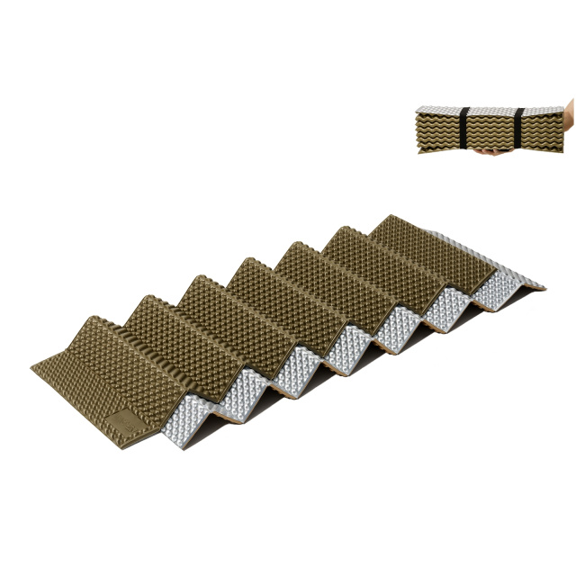 Килимок складаний Mobi Garden NT IXPE 17мм використовується для відпочинку під час подорожей. З однієї сторони килимок має алюмінієве покриття, яке добре утримує тепло та не пропускає вологу. Каремат складається "гармошкою", що дозволяє швидко трансформувати його в потрібний формат: сидіння, укорочений килимок з подушкою, чи повноцінний каремат для сну. За рахунок форми "яєчного лотку" легко складається, має невеликий об'єм, при цьому не втрачаючи в теплоізоляційних властивостях та комфорті. Характеристики: Розміри у розкладаному вигляді: 183х55 см Розміри у складаному вигляді: 56х13х14 см Матеріал: алюмінієве покриття, спінений поліетилен IXPE Товщина: 1.7 см Вага: 500 г
