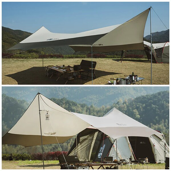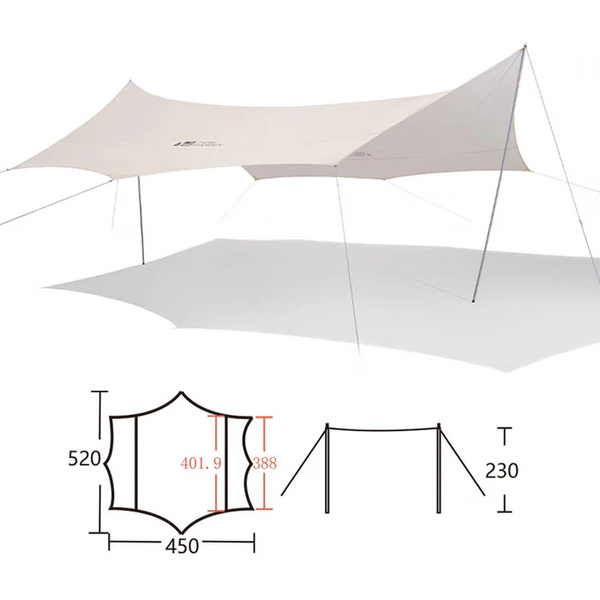 Тент надійно кріпиться за допомогою міцних вітрових мотузок у шести точках та двох стійок з прочного заліза, що гарантує його стабільність навіть у випадку сильних поривів вітру. Тканина тенту виготовлена з високоякісного поліестеру 68D 210Т, який відрізняється високою міцністю, стійкістю до розривів та володіє водовідштовхувальними характеристиками, завдяки чому легко очищається від забруднень.