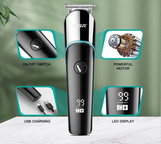Триммер VGR. Работает от аккумулятором. Заряжается очень быстро и зарядки хватает примерно на два часа работы. Благодаря специальной лазерной обработке лезвия ножевой блок сохраняет остроту в течение длительного периода эксплуатации.