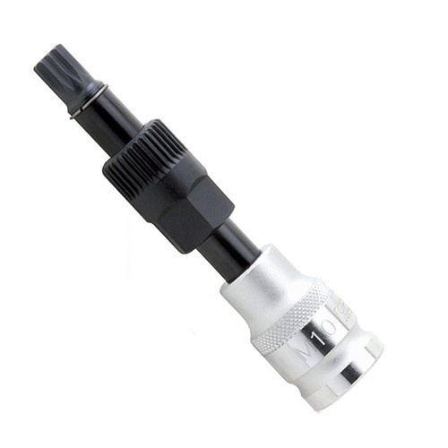 Этот инструмент позволяет зафиксировать генератор переменного тока с помощью вставного гнезда под биту M10 и позволяет ослаблять или затягивать болт центрального фиксатора шкива либо затягивать зубчатую реакционную гайку;
