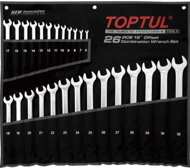 Дополнительно изгиб под углом 15° облегчает манипуляцию инструментом и обеспечивает лучший доступ к болтам и гайкам, значительно повышая комфорт и эффективность работы. Благодаря этим свойствам набор комбинированных ключей является идеальным выбором как для профессионалов, так и для любителей, которые ценят высокое качество и функциональность инструментов.