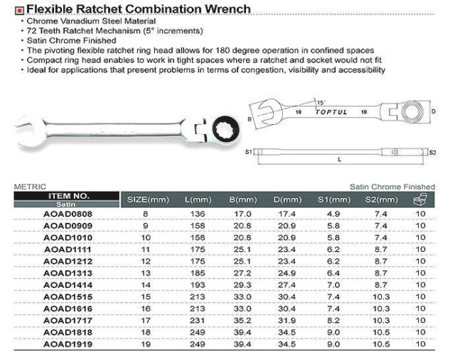 Ключ рожково-накидной трещоточный с шарниром TOPTUL 8мм AOAH0808
