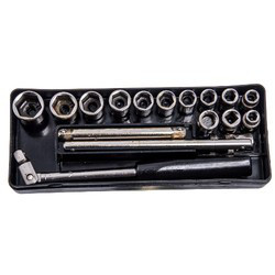Головки торцевые сменные кв.10мм. (3/8") 8, 9, 10, 11, 12, 13, 14, 15, 17, 19, 22 мм. - Головка переходная (внутр.квадрат на внутр.квадрат). - Шарнир. - Удлинитель 125 мм. - Ключ вороток ( стержень с корпусом ). - Ключ с ручкой.