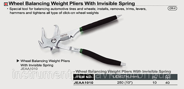 Балансировочные клещи TOPTUL JEAA1010 – это приспособление, с помощью которого можно снять, установить и подрезать балансировочные грузики, расположенные на диске колеса, расширить и сжать крепежную скобу. Клещи балансировочные предназначены для узкопрофессионального использования.