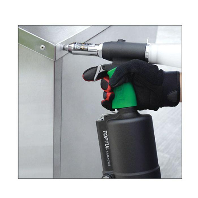Пневмогидравлический заклепочник для вытяжных заклепок TOPTUL 3.0-6.4 мм KARA0306. Подходит для заклепок из алюминия / стали и нержавеющей стали. Предназначен для профессиональной клепки и непрерывной работы. Конструкция с двойным воздухозаборником позволяет легко работать с правой или левой рукой. Новый использованный контейнер с оправой для защиты глаз оператора и поддержания рабочих мест в чистоте. Конструкция амортизатора для минимизации усталости рук. Шумоглушитель для удобства. Умная конструкция наконечника, чтобы избежать потери заклепок. Конструкция отверстия для заправки масла для быстрого заполнения запаса гидравлического масла. Комплект включает в себя сборщик оправки заклепок, два комбинационных ключа, кисть, гидравлический инжектор масла без масла и один комплект дополнительных челюстей.