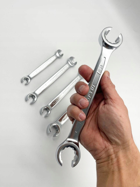 Набор полуоткрытых рожковых ключей — это комплект инструментов, необходимых в мастерской каждого механика. Ключи разработаны для работы с гидравлическими, топливными и тормозными магистралями, что делает их незаменимым набором для профессионалов, занимающихся ремонтом и обслуживанием транспортных средств и машин.