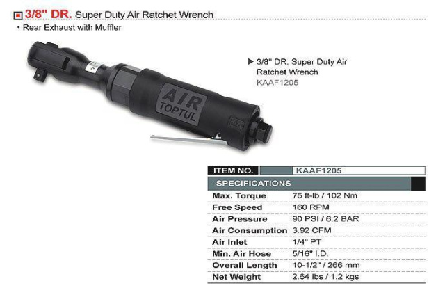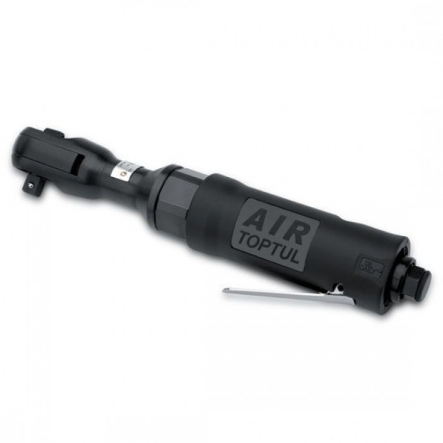 Трещотка пневматическая TOPTUL KAAF1205 присоединительный квадрат 3/8", с максимальным создаваемым усилием 102N/m, и скоростью вращения 160об/мин mini, с выводом воздуха с задней части и шумоглушителем.