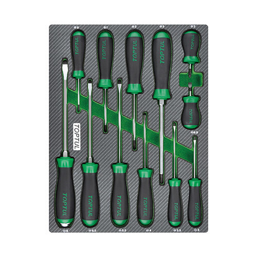 Отвёртки размещены во вкладыше для шкафа, что облегчает их организацию в ящиках и инструментальных тележках. Благодаря подходящим размерам и удобству переноски вкладыша можно адаптировать рабочее пространство под собственные потребности.