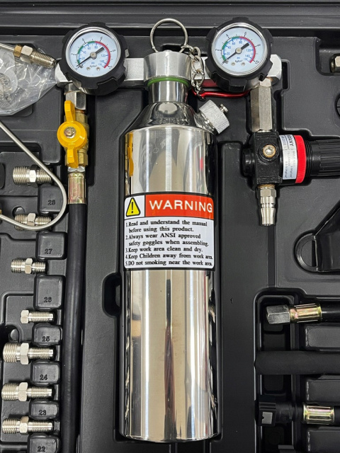 Набор оснащён двумя точными манометрами, позволяющими контролировать давление как в резервуаре, так и в топливной системе. Это обеспечивает полный контроль процесса очистки, что важно для безопасности и эффективности работы.