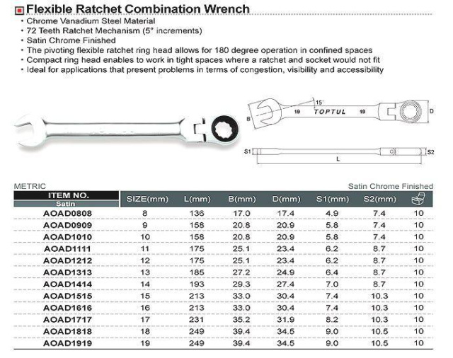 Ключ рожково-накидной трещоточный с шарниром TOPTUL 10мм AOAH1010