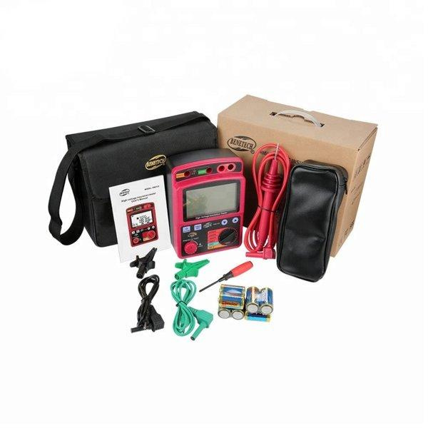 Особенностью данного измерителя сопротивления изоляции является функция тайминга для проведения тестирования изоляции, и блокировка кнопки тестирования для предотвращения случайного запуска. Также стоит отметить наличие ручного выбора диапазона тестирования и функций индикации слабого заряда батарей.