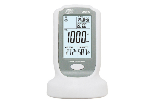 Газоанализатор на диоксид углерода GM8802 имеет большой дисплей с подсветкой, с которого удобно считываются показания, функцию сигнализации, если уровень СО2 превышает определенный заданный уровень.