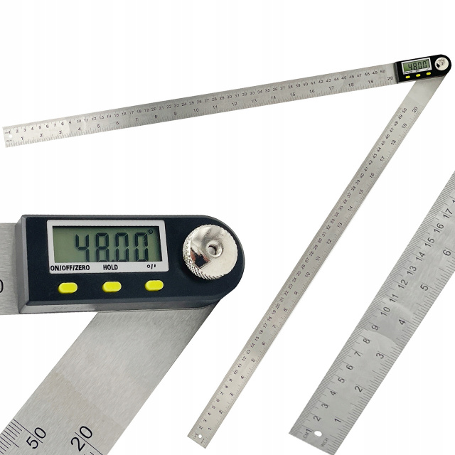Чтобы подготовить устройство к работе, необходимо соединить две линейки вместе и нажать кнопку On/Off. Затем разводите линейки до получения нужного угла — его значение появится на дисплее.