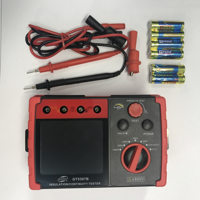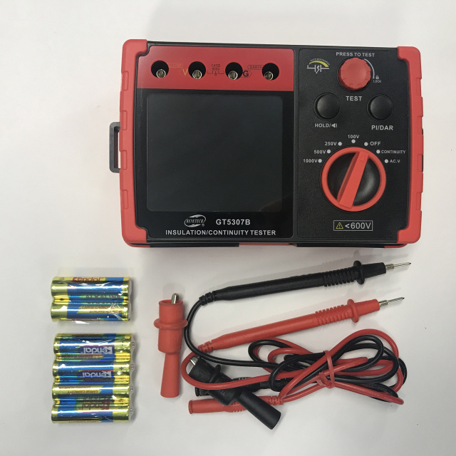Мегаомметр GT3507B предназначен для измерения значений сопротивления изоляции (до 5,5 ГОм). Тестовое напряжение от 100 до 1000 В, ток тестирования не выше 2 мА.