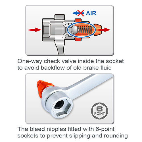 Один из ключей набора особенно разработан для прокачки тормозов с прямым встроенным односторонним клапаном-проверкой, препятствующим возвращению старой тормозной жидкости или исчерпанного воздуха. Это обеспечивает безопасность и эффективность процесса прокачки тормозов.