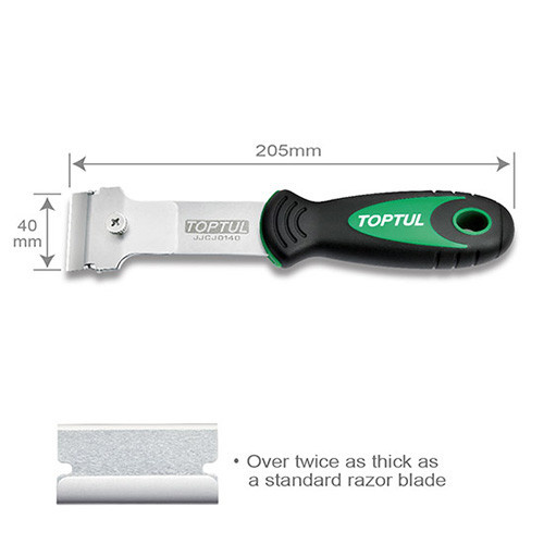 Скребок со сменным лезвием 40х205мм – идеальный инструмент для быстрого удаления меток, печатей, красок и остатков клея из стекла или металлических поверхностей.