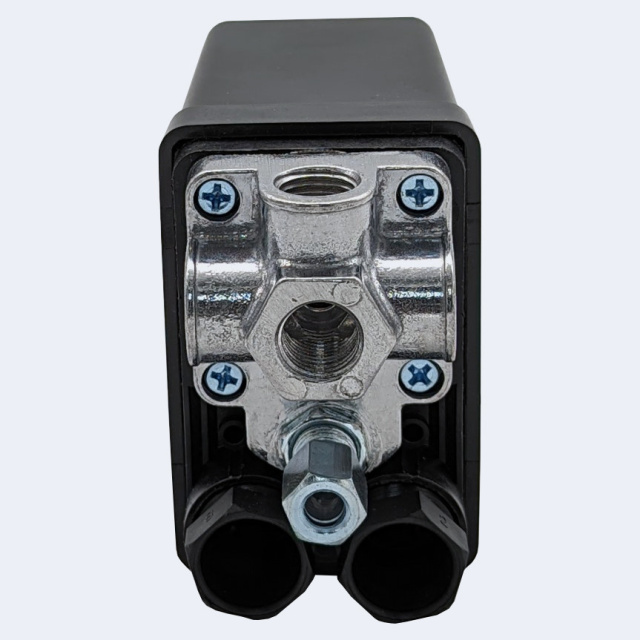 Прессостат, то есть реле давления (управляющий блок), предназначен для автоматического контроля давления в ресивере компрессора согласно заданным параметрам. Применяется в однофазных поршневых компрессорах с напряжением 380 В и максимальной мощностью до 3 кВт.