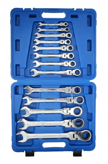 Профессиональный набор из 13 комбинированных ключей с трещоткой и шарниром в прочном кейсе. Каждый ключ оснащён подвижной накидной головкой с храповым механизмом (трещоткой), что позволяет удобно и быстро работать даже в труднодоступных местах. Шарнирные головки обеспечивают гибкость в работе и лучший доступ в ограниченном пространстве.