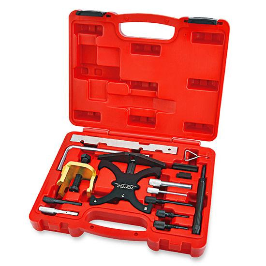 Комплектация: включает фиксаторы звездочек распределительного вала (VCT плита), фиксаторы коленчатого вала/маховика, натяжителей, съемник звездочек распределительного вала.