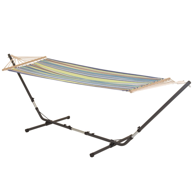 Bo-Camp Universal Grey - прочная и очень удобная стойка для гамака. Она легко собирается и разбирается с помщью винтовых зажимов, а ножки с противоскользящими накладками предотвратят нежелательное перемещение стойки во время отдыха в гамаке, а также уберегут поверхность пола от повреждений при использовании или перемещении. Благодаря конструкции рамы, выполненой из стальных труб с порошковым покрытием, подставка имеет большой диапазон регулировок. Подходит для гамаков общей длиной до 385 см, а высота поднимается до 140 см. Кроме того, стойка является мобильной, так как в разобранном виде компактно помещается в идущий в комплекте чехол.
