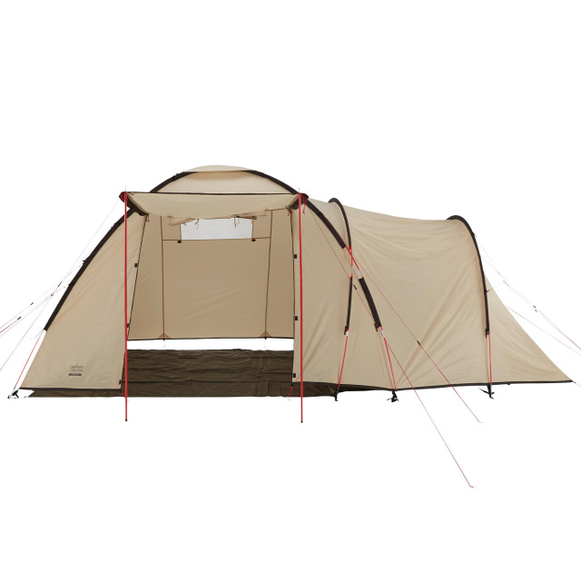 - Палатка имеет комбинированную купольно-туннельную конструкцию каркаса, поэтому имеет преимущества обеих конструкций. Высокий тамбур имеет купольную конструкцию с четырьмя точками опоры каркаса в землю и одной точкой пересечения дуг, благодаря чему достигается необходимая устойчивость и сопротивление ветровой нагрузке. Более низкая спальная часть имеет туннельную конструкцию, благодаря чему обеспечивает большее внутреннее пространство, а для увеличения устойчивости дуги имеют две точки пересечения с купольным каркасом тамбура.