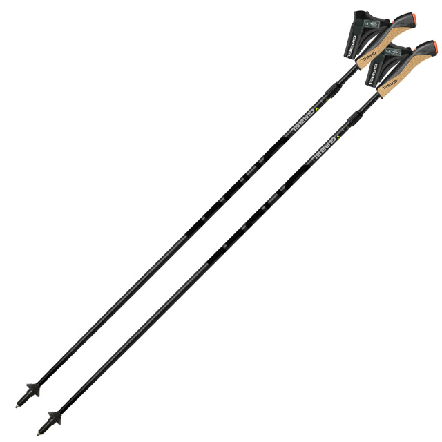 Трехсекционные палки имеют верхнюю (более удобную) телескопическую систему регулировки высоты в пределах от 105 до 130 см и систему складывания Twist Lock, благодаря чему в транспортном положении имеют длину всего 52 см. Прогрессивная технология Snake Carbon, по которой изготовлены карбоновые секции палок, увеличивает прочность на излом, уменьшает вес и позволяет более эффективно гасить вибрации, придавая палкам привлекательный агрессивный внешний вид. Рукоятка имеет двухслойную накладку из коркового дерева, препятствующую потоотделению, и оснащена системой быстрого отстегивания темляка. Нужный наклон рукоятки, эффективный крой темляка и форма сапожка способствуют формированию правильной техники скандинавской ходьбы.