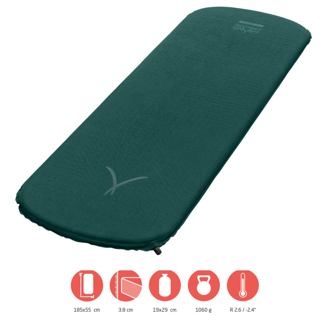Самонадувной коврик Grand Canyon Hattan 3.8 М - это облегченная версия, позволяющая комфортно разместиться пользователям с ростом до 1.85 метра, и обеспечивающая надлежащие термоизоляционные свойства при температуре до -2.4°С. Безусловно эта модель достаточно компактная и легкая, как для самонадувного коврика. Верхняя оболочка Hattan 3.8 M имеет мягкую на ощупь текстильную поверхность, нижняя сторона минимизирует скольжение на гладком полу палатки. Простой в использовании винтовой клапан обеспечивает быстрое самонадувание и дает возможность последующего надувания и быстрого сдувания после использования.