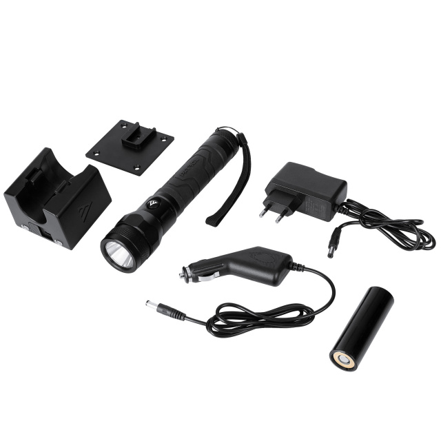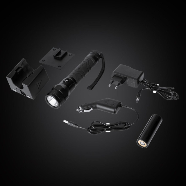 Питается фонарь от аккумулятора Li-Ion 5000 mAh, что обеспечивает до 11 часов непрерывной работы в минимальном режиме или 2,5 часа в режиме HIGH. Такое решение идеально для служб, работающих посменно — достаточно просто поставить фонарь на базу, и он будет готов к следующему выезду.