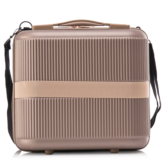 Бьюти-кейс оснащен верхней ручкой с мягкой подкладкой, имеет внутренний карман и разделен перегородкой на молнии на две части. В комплекте поставляется пристегивающийся ремешок на карабинах.