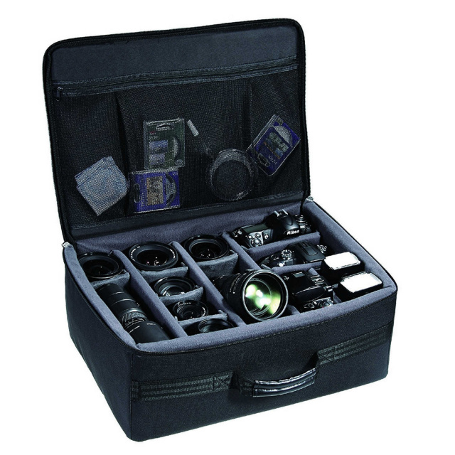 Съемная сумка с девятнадцатью модульными перегородками позволяет надежно зафиксировать и отделить друг от друга все оборудование вплоть до мелких аксессуаров. Сумка имеет мягкие стенки, и защищает размещенное в ней оборудование. С такой сумкой нет надобности постоянно использовать кейс, когда в нем нет 100% необходимости. Компания Vanguard традиционно внимательно относится к деталям, среди которых особенно хотелось бы выделит армированные сталью проушины для навесных замков, использование подшипников в колесах, три мягкие ручки с резиновой накладкой и одну выдвижную ручку, прорезиненные нескользящие ножки и широкие удобные защелки с надежной фиксацией.