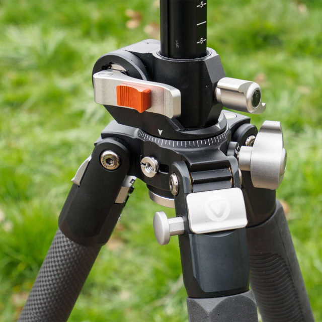 Сам штатив также имеет пузырьковый уровень и резьбу для консольного крепления дополнительного оборудования. Все наиболее ответственные детали выполнены из нержавеющей коррозионностойкой углеродистой стали марок SUS303, SUS304, 1018. Мультипозиционная колонна выполнена из алюминиевого сплава Alu 6063-T5, в то время, как винты и клипсы зажимов, равно как и шаровая головка, производятся из более прочного, так называемого авиационного алюминия, марки Alu 6061-T6.