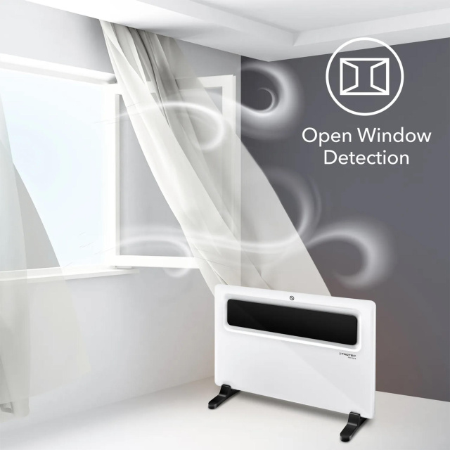 Конвектор оборудован встроенным термостатом и может работать только в случае понижения температуры в помещении ниже заданного уровня в диапазоне от 0ºС до 50ºС. А в случае проветривания комнаты будет автоматически снижать интенсивность нагрева для еще большей экономии энергии.