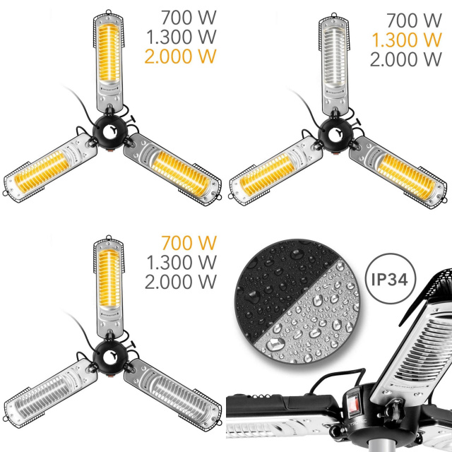 Trotec IRS 2005 изготовлен из атмосферостойкого алюминия и защищен от брызг в соответствии с классом защиты IP34 (защита от водяных брызг с любого направления). Три отдельные инфракрасные панели включаются поочередно, и вы сможете нагревать только необходимую зону и экономить электроэнергию.