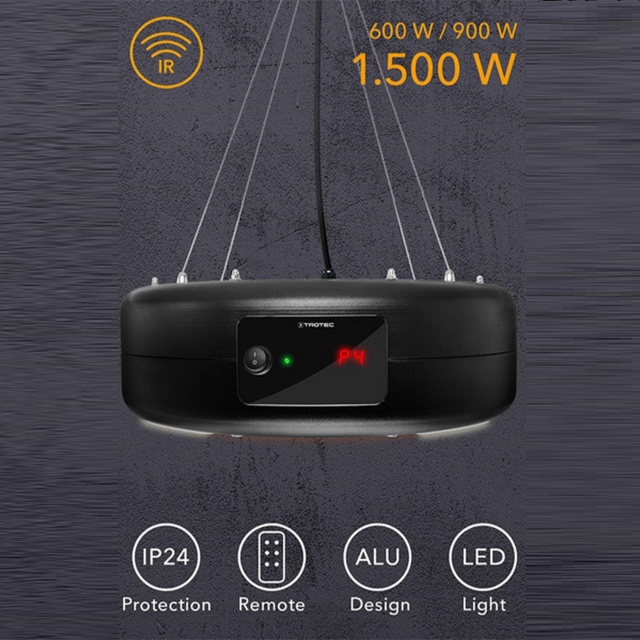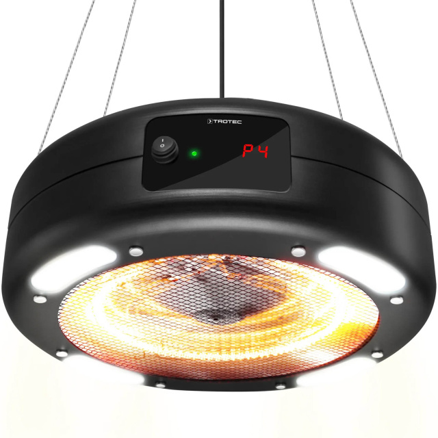 Потолочный инфракрасный обогреватель Trotec IR 1550 SC с защитой по стандарту IP24 (защита от брызг воды c любого направления), изготовлен из устойчивого к атмосферным воздействиям алюминия. Две мощные галогеновые лампы с тремя уровнями нагрева (600 Вт/900 Вт/1500 Вт) всегда обеспечивают столько уютного мгновенного тепла, сколько требует местоположения и назначения. При необходимости можно включить четыре ярких светодиодных лампы (можно также использовать без включенного нагрева), превратив потолочный обогреватель в функциональный рабочий светильник и стильный аксессуар. С помощью пульта дистанционного управления можно легко и удобно выбрать уровень нагрева и режимы работы. Тепло, излучаемое на 360° вниз от 45-сантиметрового рефлектора, можно ощутить на площади в 10 м².