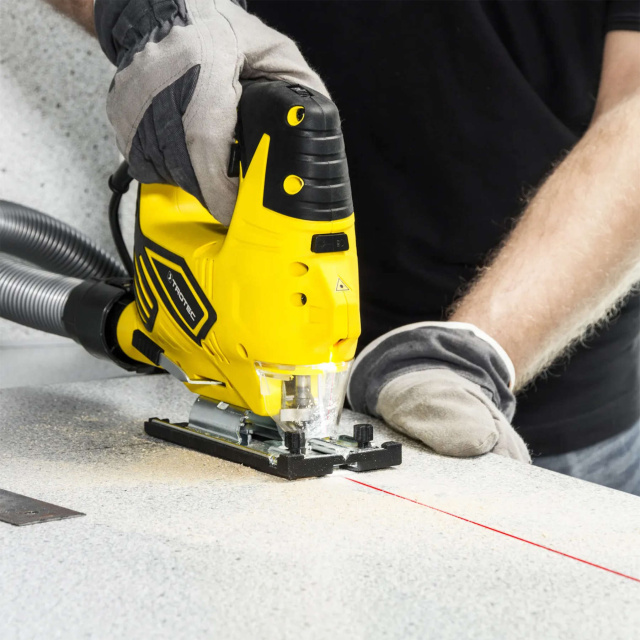 Trotec PJSS 12-230V оборудован универсальным переключателем, позволяющим включать и выключать отдельно и вместе лазерный уровень и светодиодное освещение рабочей зоны. Лазер проецирует четкую красную линию на заготовку и таким образом точно указывает направление резки, облегчая ведение лобзика свободной рукой вдоль прямого реза. Таким образом, отклонение от линии реза можно сразу обнаружить и исправить.