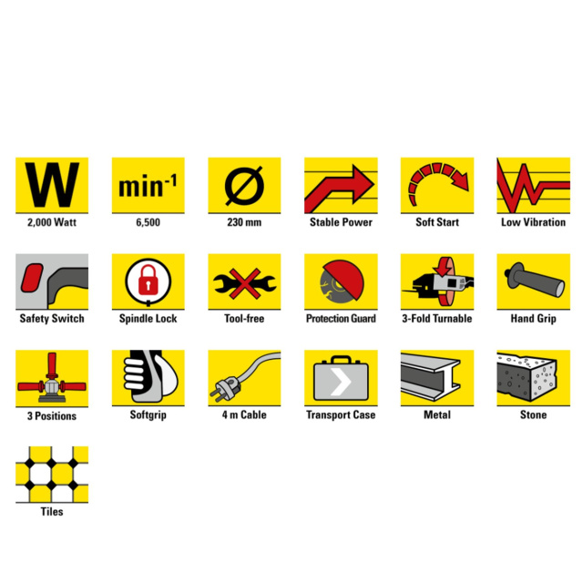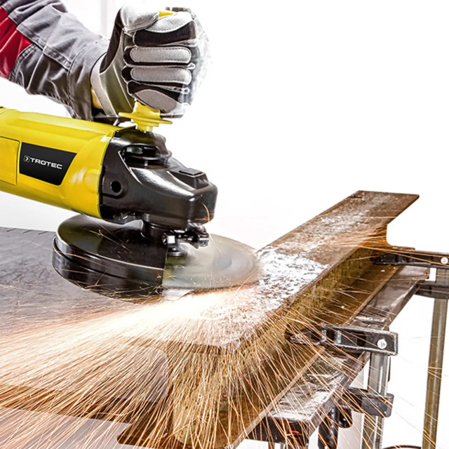 Инструмент разработан для легкого и безопасного использования благодаря эргономичной длинной ручке с резиновыми вставками. Дополнительная рукоятка обеспечивает работу двумя руками без усталости и может быть установлена в трех положениях, горизонтально или вертикально, или чтобы подготовить угловую шлифовальную машину для левшей. Это означает, что устройство всегда надежно лежит в руке даже во время длительной работы. Так же удобно над кнопкой пуска расположена кнопка, предотвращающая случайное включение устройства, так что включить устройство можно одним пальцем одной рабочей руки.
