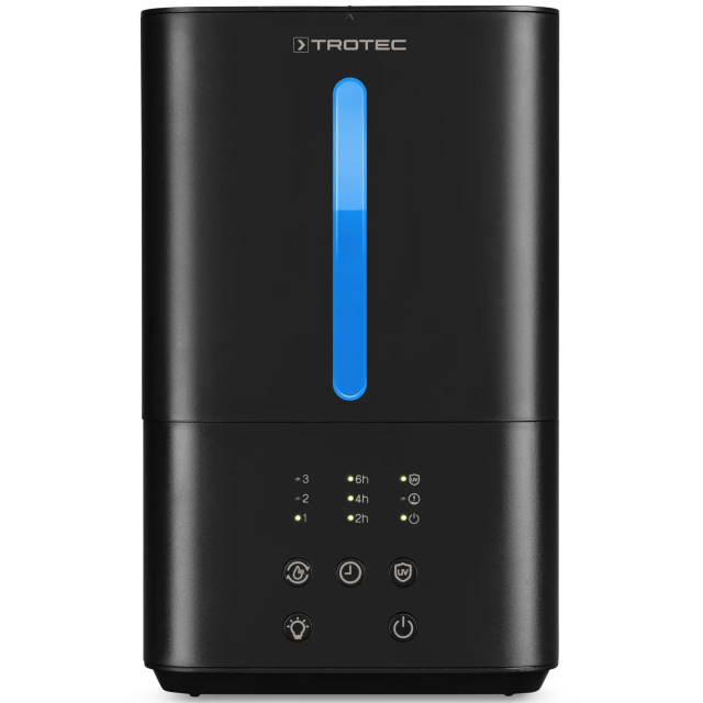 Увлажнитель воздуха имеет светодиодную подсветку, которая подсвечивает резревуар для воды и может быть выключена при необходимости. Trotec B 4 E Black оснащен предупредительной светодиодной индикацией на дисплее, которая заблаговременно оповещает о низком уровне воды, чтобы ее можно было вовремя пополнить. Как только вода в резервуаре заканчивается, увлажнитель автоматически выключается.