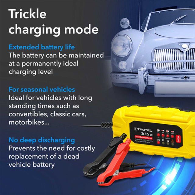 Режим капельной зарядки используется для постоянной и безопасной компенсации саморазряда батареи (свинцово-кислотной, AGM и гелевой). Максимальная зарядная емкость поддерживается постоянно без повреждения аккумулятора из-за чрезмерной зарядки. Идеально подходит для предотвращения глубокого разряда аккумулятора в редко используемых автомобилях, таких как ретро-автомобили или кабриолеты с сезонными номерными знаками.