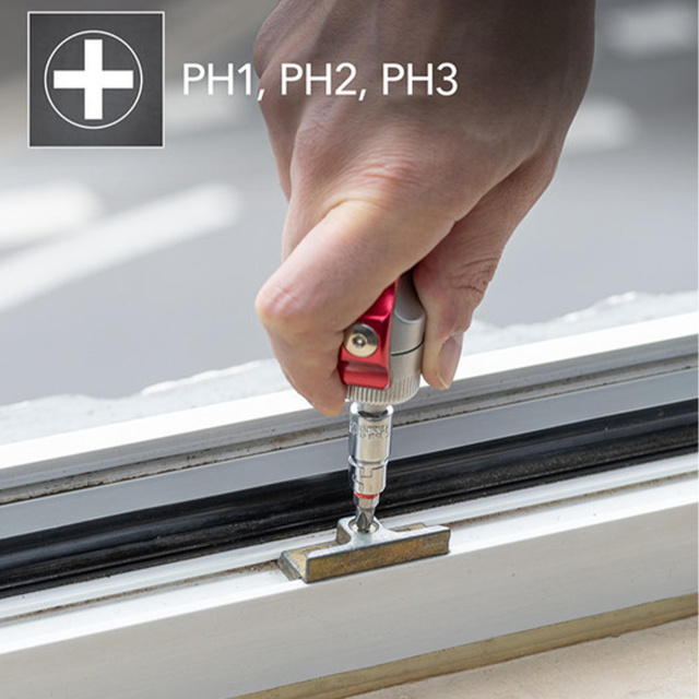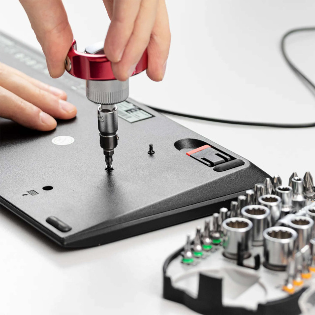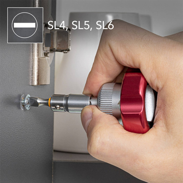 Несмотря на компактные размеры, отвертка, входящая в комплект, поражает своим удобством. Полукруглую металлическую рукоятку можно повернуть на 90° для комфортного держания в руке. Эргономичные выемки для пальцев обеспечивают надежный хват и оптимальную передачу усилия. Направление вращения можно менять с помощью переключателя в кольце храповика, также есть возможность полной блокировки. Трещотка имеет 48 зубцов и минимальный угол возврата всего 7,5°, что позволяет работать даже в труднодоступных местах с высокой точностью.