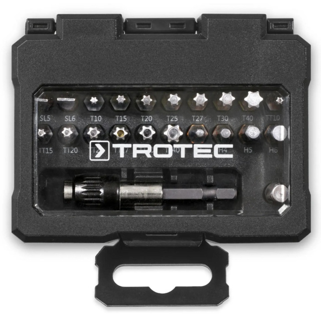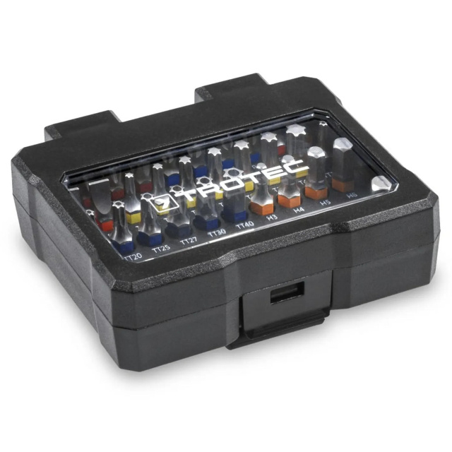 Набор бит Trotec PSCS Screwdriver 32 pieces Bit Set состоит из 32 элементов и изготовлена из прочной инструментальной стали S2. В удобном контейнере с практичным креплением на ремень все насадки защищены от выпадения и имеют цветовую маркировку в соответствии с типом, что облегчает выбор нужной насадки. Кроме 30 насадок для завинчивания, этот набор также содержит адаптер-переходник от 1/4" квадрата до 1/4" шестигранника для торцевых головок и быстрозаменяемый держатель для насадок с возможностью работы одной рукой.