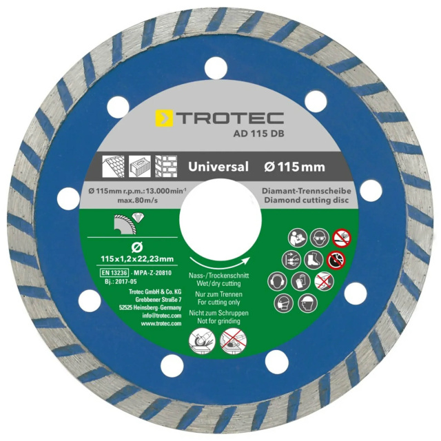 Независимо от того, планируете ли вы использовать алмазные диски для резки камня, бетона или плитки, профессиональные пользователи ожидают быстрой резки, длительного срока службы и необходимого уровня безопасности. Поэтому следует доверять алмазным дискам, соответствующим стандартам качества и безопасности согласно EN 13236. Именно таковы отрезные алмазные диски из набора Trotec 110/115х22.23х1.2 (4 шт) (6225001121).