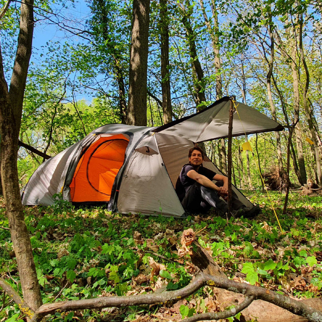 - Торцеві вхідні двері мають спеціальну фурнітуру, що дозволяє використовувати її в якості навісу, застосувавши трекінгові палки як опори і зафіксувавши їх відтяжками.