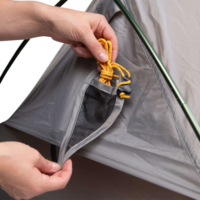 Оттяжки палатки желтого цвета имеют вплетенную отражающую нить, благодаря чему они остаются хорошо заметными в светлое время суток и темное время суток в свете фонарика. На оттяжках закреплен специальный флажок с сетчатым карманчиком, куда можно сложить скрученную оттяжку, работающий в виде сигнального флажка для быстрого визуального обнаружения оттяжек установленной палатки.