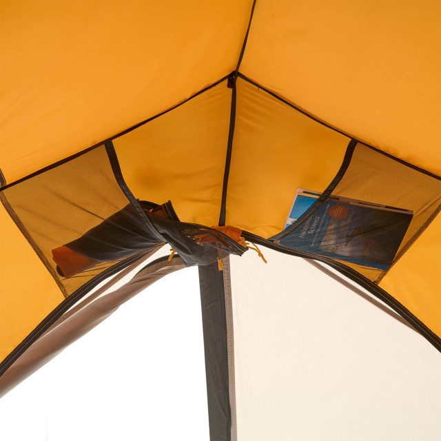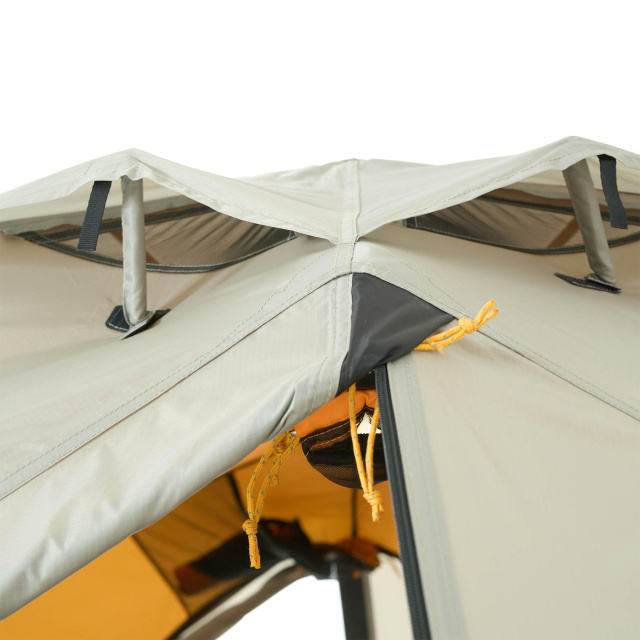 Палатка имеет 4 больших вентиляционных клапана APEX, расположенных в верхней части тамбуров. Таким образом, обеспечивается правильная вентиляция внутренней палатки и внешнего тента, предотвращается образование конденсата и регулируется внутренняя температура. Клапана фиксируются жестким фиксатором на застежке Velcro и не создают нежелательного шума даже под порывистым ветром. Часть внутренней палатки выполнена из сетки NoSeeUm, что также улучшает проветриваемость.