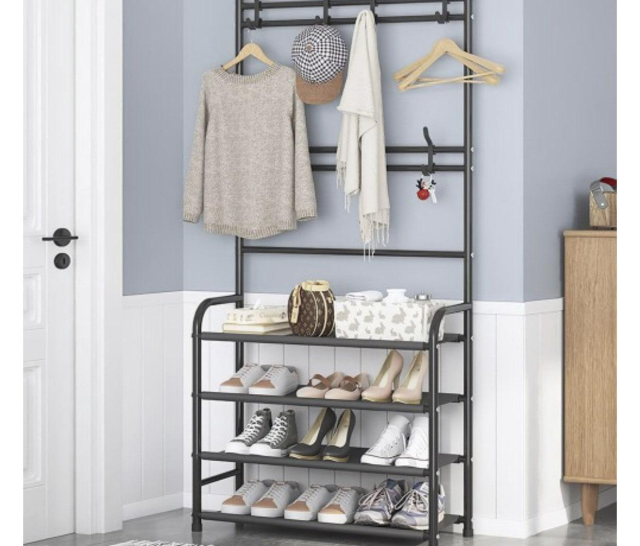 Под одеждой на полках вешалки удобно хранить обувь и аксессуары