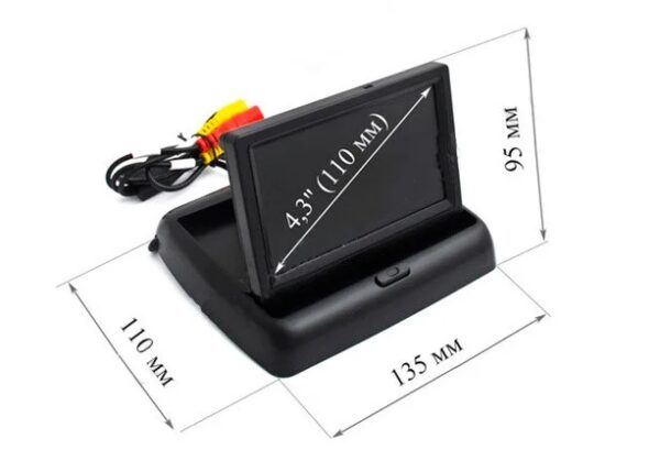 Конструкция данного монитора позволяет его складывать в те моменты, когда в его использовании нет необходимости. Раскладывается монитор одним нажатием на кнопку на лицевой поверхности. Цветной дисплей позволяет удобно просматривать изображение с камеры заднего вида. Монитор оснащен двумя видеовходами, что позволяет подключить к нему, например, камеру переднего вида (либо 2-ю камеру, установленную внутри салона – очень удобно для водителей такси) или DVD-проигрыватель.