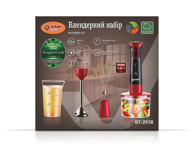 Блендер заглибний 4 в 1 1800W BITEK BT-293 це потужний і функціональний помічник на вашій кухні. Завдяки своїй продуктивності 1800 Вт, він легко справляється з будь-якими завданнями з подрібнення, змішування та пюрування інгредієнтів.
