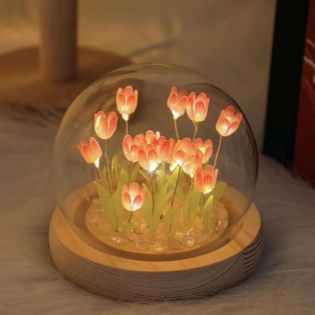Нічник-світильник "Тюльпани в колбі з LED підсвічуванням" на дерев'яній підставці – це вишукане рішення для створення затишної атмосфери у вашому будинку. Елегантна форма кулі та майстерно оформлені тюльпани роблять її не тільки привабливим елементом декору, але й функціональним аксесуаром.