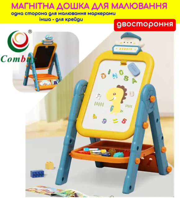 Ця дошка з подвійною рисувальною поверхнею стане незамінним помічником у навчанні та розважальних іграх для малюків. Зручна регульована підставка дозволяє налаштувати висоту дошки під зростання дитини, що робить використання ще комфортнішим.
